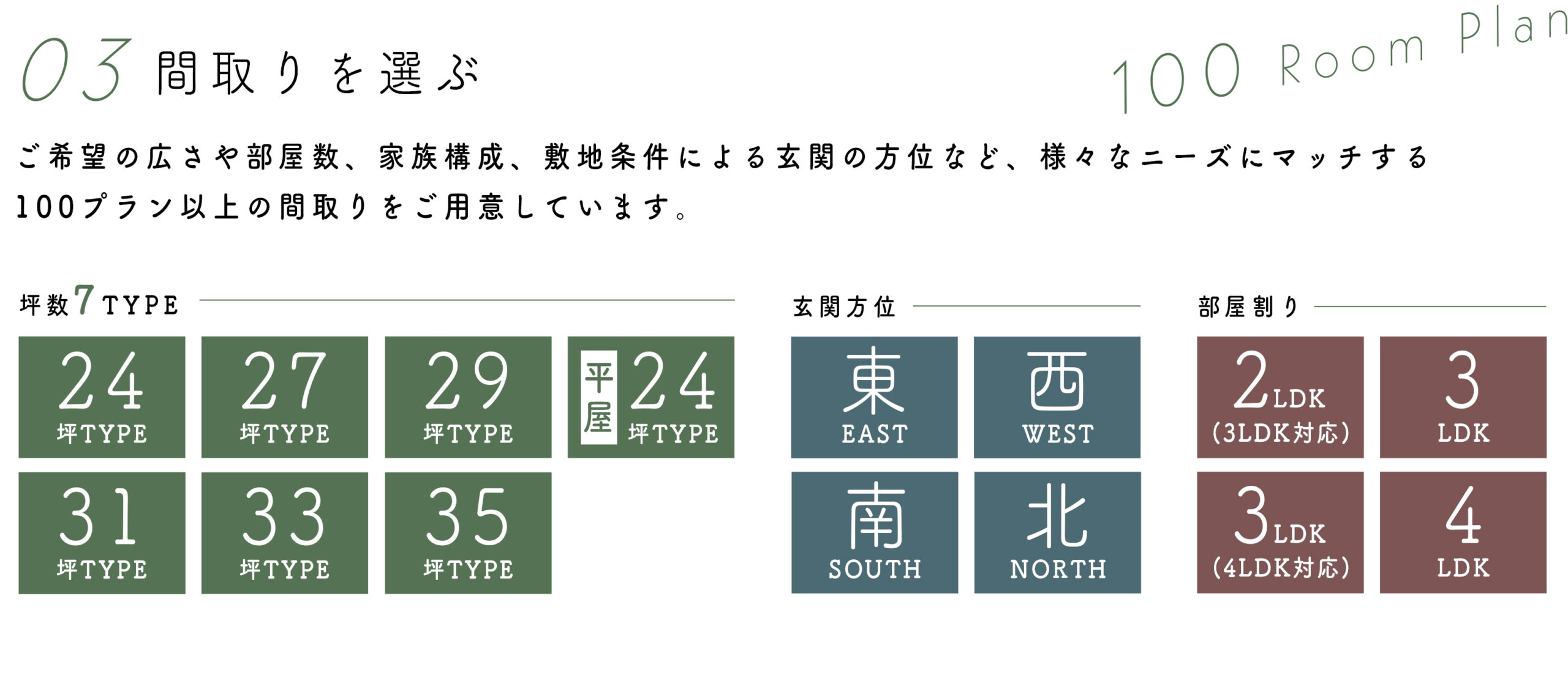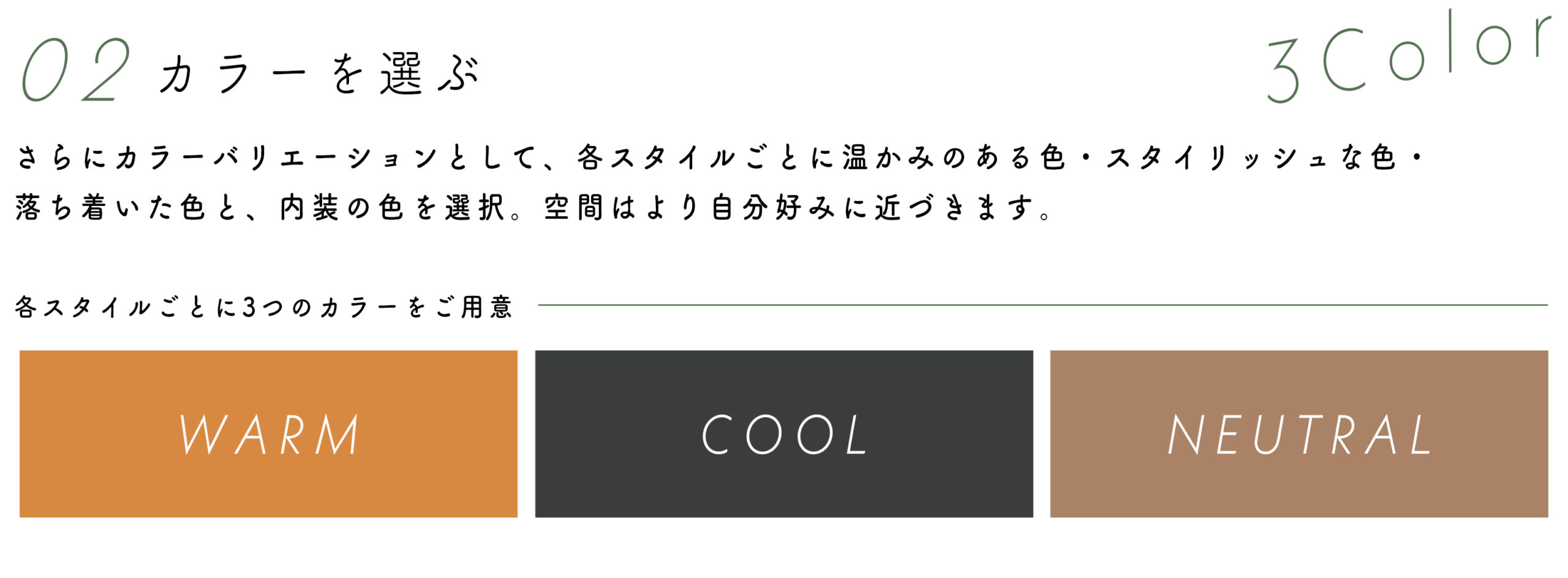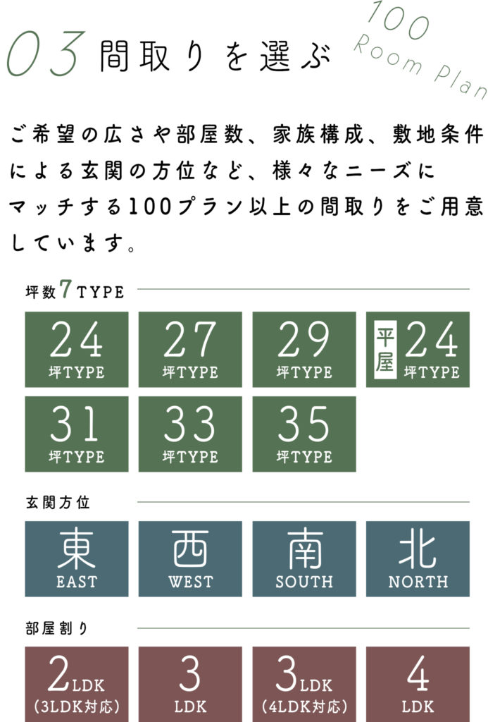 間取りの広さや方位、形状など、4800通りのパターンセレクトをご用意することで、より理想に近い住まいづくりをご提案します。 たとえば4つの「スタイル」では、住まう方の好みを想定しながら、色彩・空間演出の専門家ならではのトータルコーディネートを設定。 さらに、それぞれのスタイルごとに3つの「カラー」をご用意することで、より細やかにご家族のセンスに沿った住まいをセレクトできます。 この多彩な選択肢の中からベストの空間を選んで、理想の生活をお楽しみください。