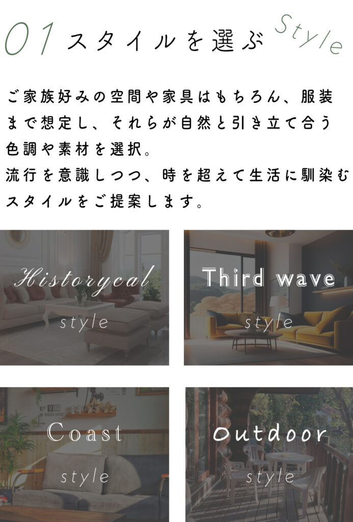 注文建築をお考えのお客様は、インテリア雑誌などをたくさん読み、それぞれの理想の住まい像を強くイメージされている方も多いはず。しかし、実際に壁や床、建具などの色などを好みに合わせて選ぶと、全体を組み合わせたときにバランスがちぐはぐだったり、イメージとかけ離れてしまうことが少なくありません。 HOME STANDでは「Historical」「Third Wave」「Coast」「Outdoor」という遊び心のある4つのデザインテーマを設け、生活空間をご提案しています。