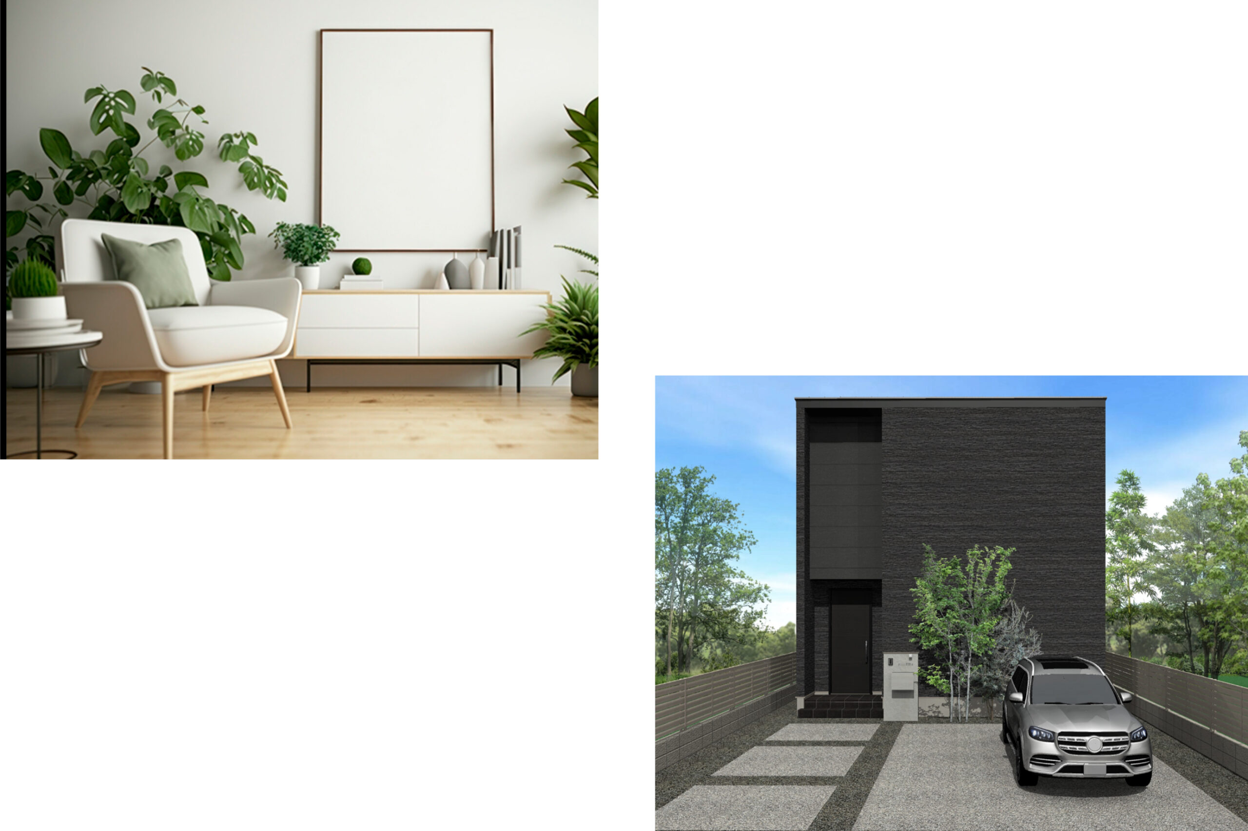 たとえば、ホワイトキューブの外壁に、幾何学的な窓で表情を付けたり、木目調のボーダータイルで自然なやさしさをプラスしたり。