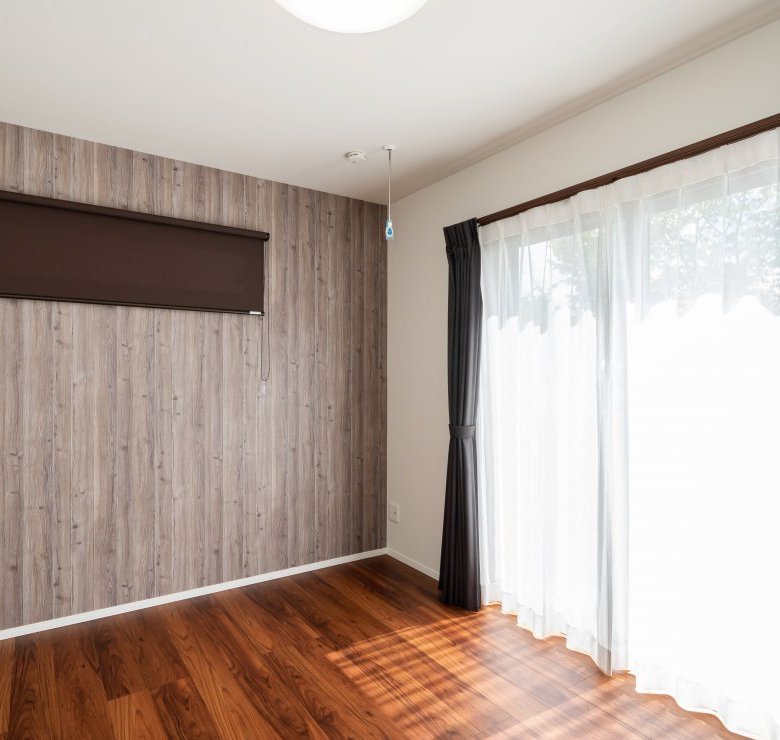 壁紙を変えたり、レザー調のカーテンをつける事で落ち着いた雰囲気に仕上げました。